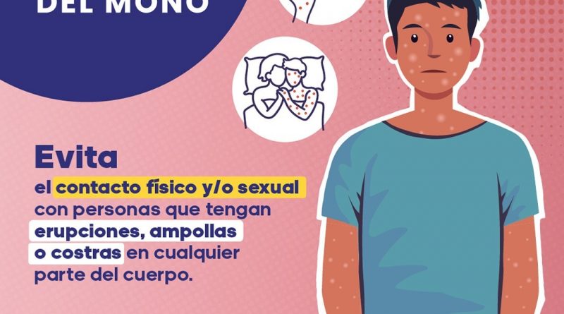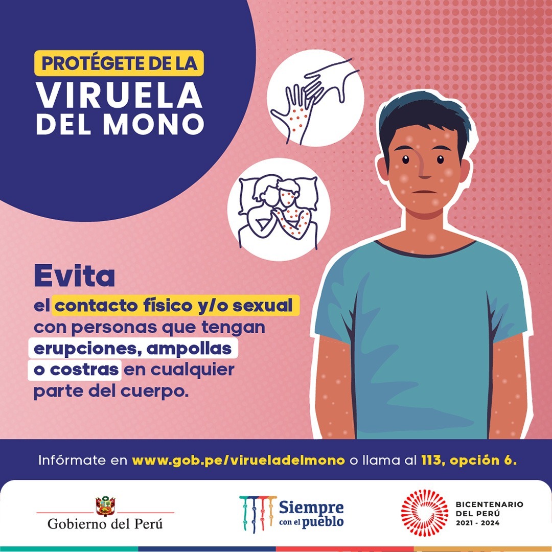 ¡Protégete de la viruela del mono! Evita el contacto físico y/o sexual con personas que tengan erupciones, ampollas o costras en cualquier parte del cuerpo. Si presentas síntomas llama al 113 opción 6 o acude al establecimiento de salud.