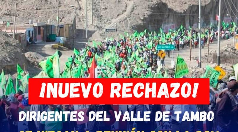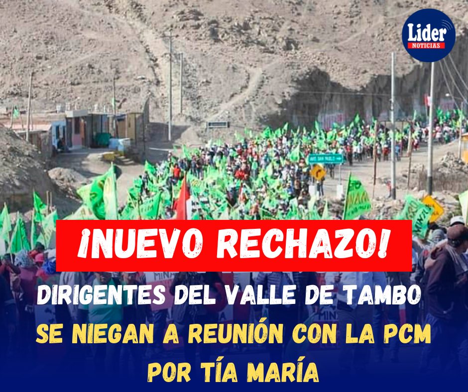 Los dirigentes del valle de Tambo, en la provincia de Islay, rechazaron la invitación de la Presidencia del Consejo de Ministros (PCM) para dialogar sobre el proyecto minero Tía María. La reunión estaba programada entre el 9 y 10 de octubre en Lima, pero los representantes locales se negaron a viajar y exigieron que el encuentro se realice en su propia zona.