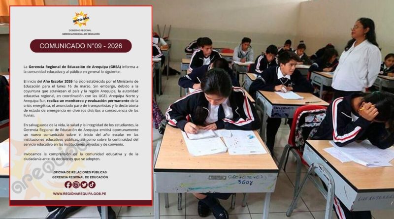 Arequipa. La incertidumbre se apodera del sector educativo en la Ciudad Blanca. Mediante un comunicado oficial, la Gerencia Regional de Educación de Arequipa (GREA) informó que el inicio del año escolar 2026, programado originalmente para este lunes 16 de marzo, se encuentra bajo evaluación. La medida responde a la crisis multifactorial que afecta a la región, donde el paro de transportistas, el desabastecimiento de combustibles y los daños causados por las intensas lluvias han generado un escenario de inseguridad para el desplazamiento de miles de estudiantes y docentes.